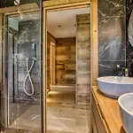 Megève Le Yack Chalet jusqu'à 15 pers comprend une salle de bains avec une toilette séparée et une douche. Un sèche-cheveux et des draps de bain sont également fournis.